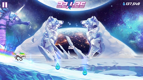 跑酷游戏的玩法一目了然:左键跳跃悬崖,右键冲击障碍,一路上以收集水滴得分,并完成规定任务。不得不说的是,独角兽冲击障碍的一瞬间真的很爽!并且玩家可以通过积分来获取特殊技能,独角兽目前拥有12种技能,各个技能都非常实在好用!游戏中还添加了一个小BOSS,不用说,加大马力,撞死它就行了。
