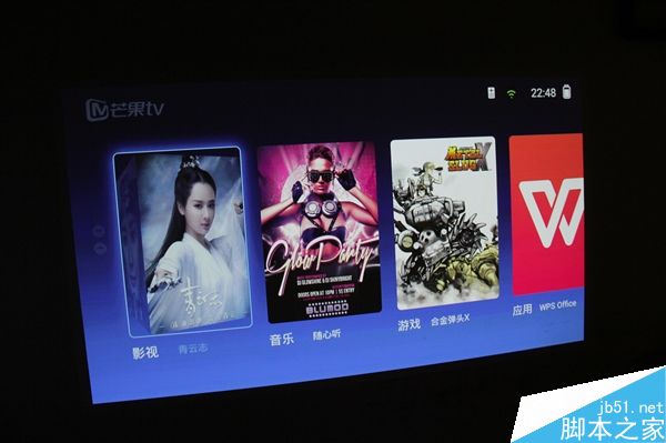 它可以看作电视盒+投影仪+音响的综合体,既可以连接手机、Pad听歌,也能联网在墙壁、幕布上投影看网络电视(芒果TV系统平台)。